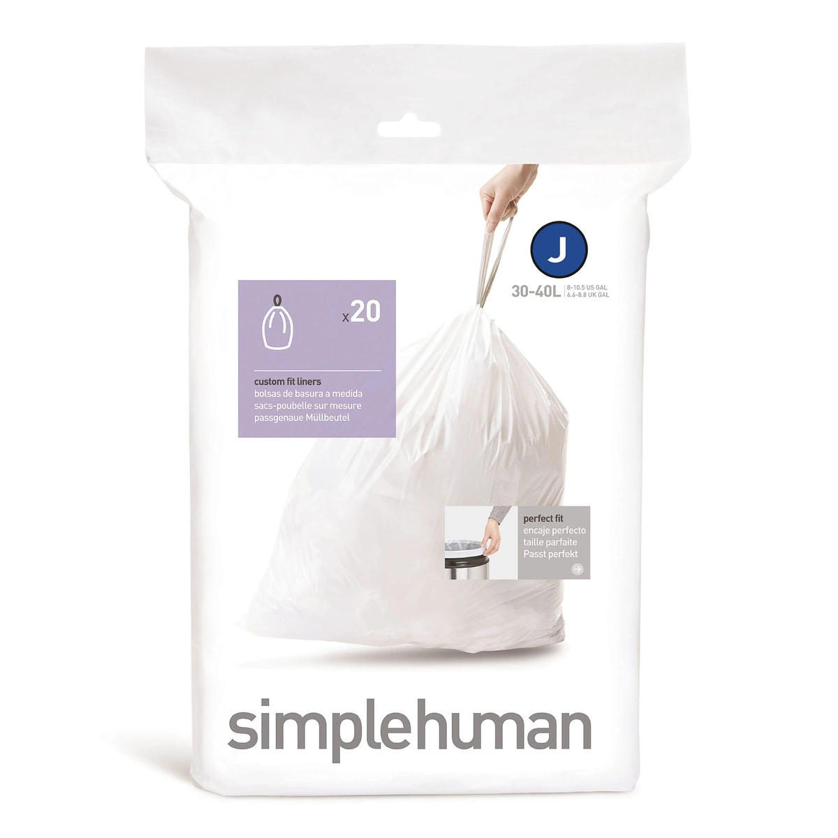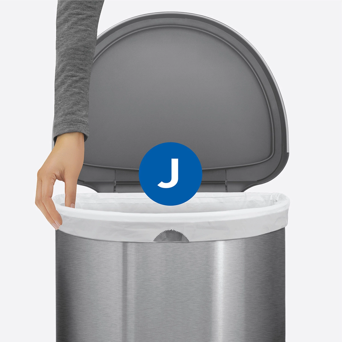 Worki na śmieci simplehuman o pojemności 30-45 litrów, oznaczone przez producenta rozmiarem J, są idealnie dopasowane do koszy simplehuman. Dzięki temu nie ślizgają się, nie ściągają i pozostają starannie ukryte, gdy pokrywa kosza jest zamknięta.