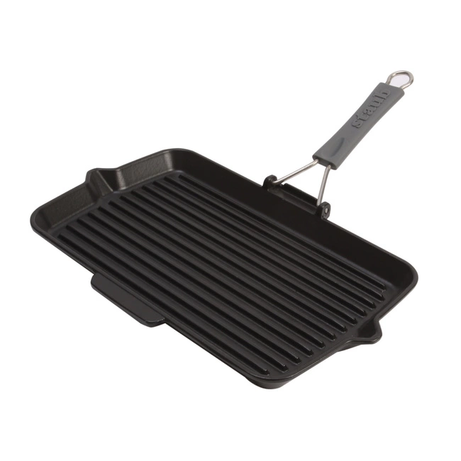 Patelnia Staub została wyposażona w składaną silikonową rączkę, która jest odporna na temperatury do 200 stopni Celsjusza, co pozwala na używanie patelni w piekarniku. Składana rączka to także duża zaleta podczas przechowywania – patelnia zajmuje mniej miejsca i łatwo mieści się w kuchennej szafce.