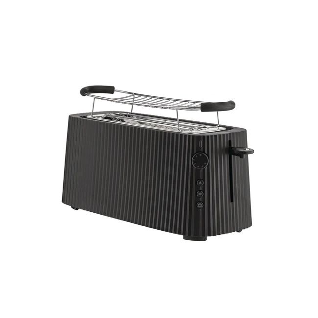 Toster XXL Plissé od Alessi posiada korpus wykonany z żywicy termoplastycznej, wyposażony w kontrolkę zasilania, pokrętło regulacji opiekania, dźwignię podnoszenia oraz przyciski ANULUJ, ROZMRAŻANIE i BAGEL. Dodatkowo, toster posiada tackę na okruszki i specjalny stojak do podgrzewania brioszek wykonany ze stali nierdzewnej 18/10 i żywicy termoplastycznej.