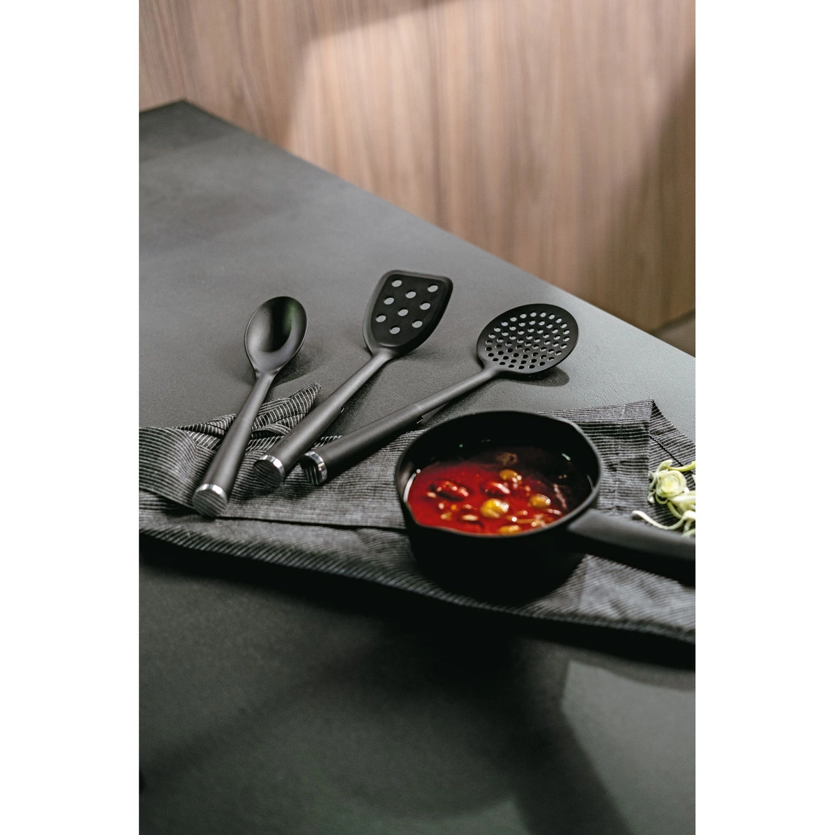Zestaw składa się z pięciu niezbędnych akcesoriów kuchennych: łyżki, łopatki, chochli, szczypiec oraz trzepaczki. Każde z nich zostało starannie zaprojektowane, aby zapewnić maksymalną wygodę podczas gotowania. Akcesoria są umieszczone na stabilnym stojaku, który pozwala na łatwy dostęp do nich w każdej chwili.