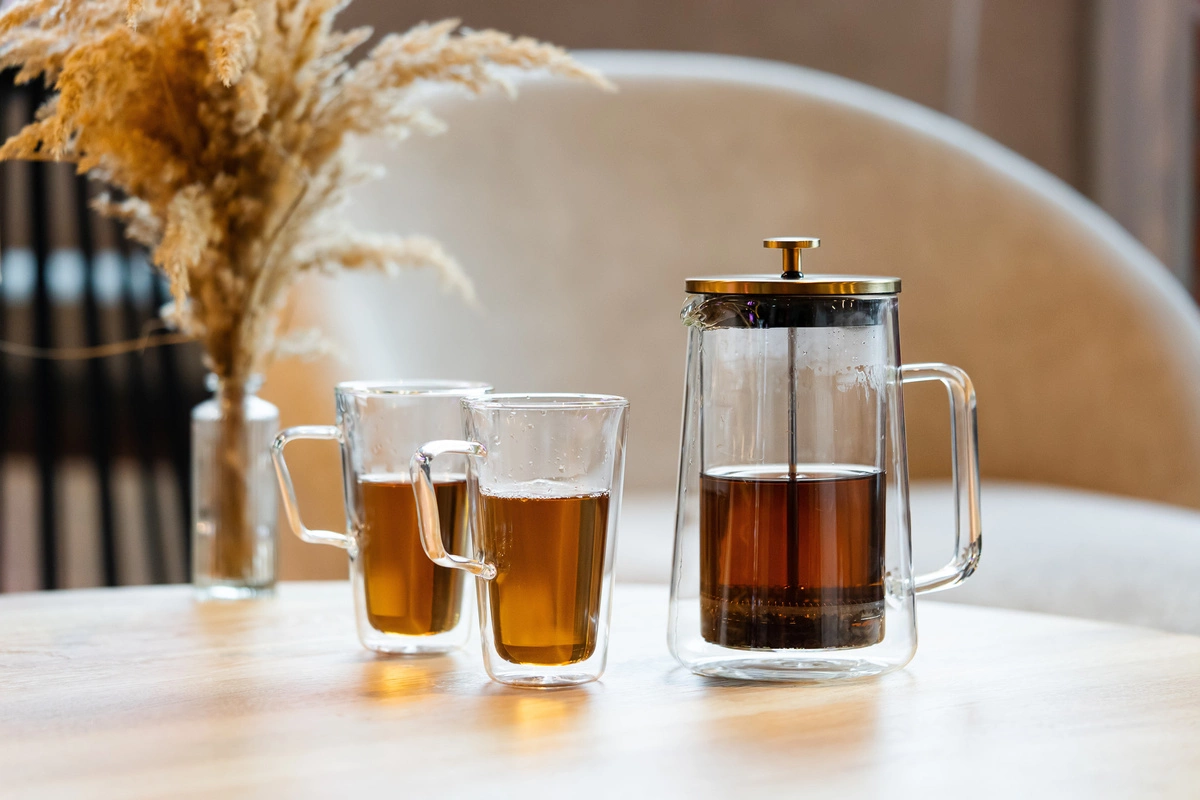 Dzbanek wykonany jest ręcznie z wysokiej jakości szkła borokrzemowego, które jest bezpieczne dla zdrowia i niewpływające na smak napoju. Zaparzacz został zaopatrzony w pokrywę ze stali nierdzewnej w kolorze matowego złota, co dodaje mu elegancji i stylu.