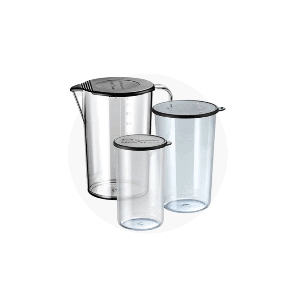 Do 3-częściowego zestawu pojemników dołączona jest funkcjonalna pokrywka z zatrzaskiem, która szczelnie zamyka pojemniki. Wykonane z wysokiej jakości materiału, są odporne na temperatury od -20°C do +100°C, można je używać w kuchence mikrofalowej i myć w zmywarce. Są bezpieczne dla żywności i nie zawierają bisfenolu A (BPA). Trwały i solidny silnik AC, wyprodukowany w Szwajcarii, zapewnia potężną wydajność i bezproblemową pracę. Czyszczenie wszystkich akcesoriów jest równie łatwe, jak ich obsługa. Gotowy do użycia w kilka sekund, czyści się dosłownie w kilka sekund.