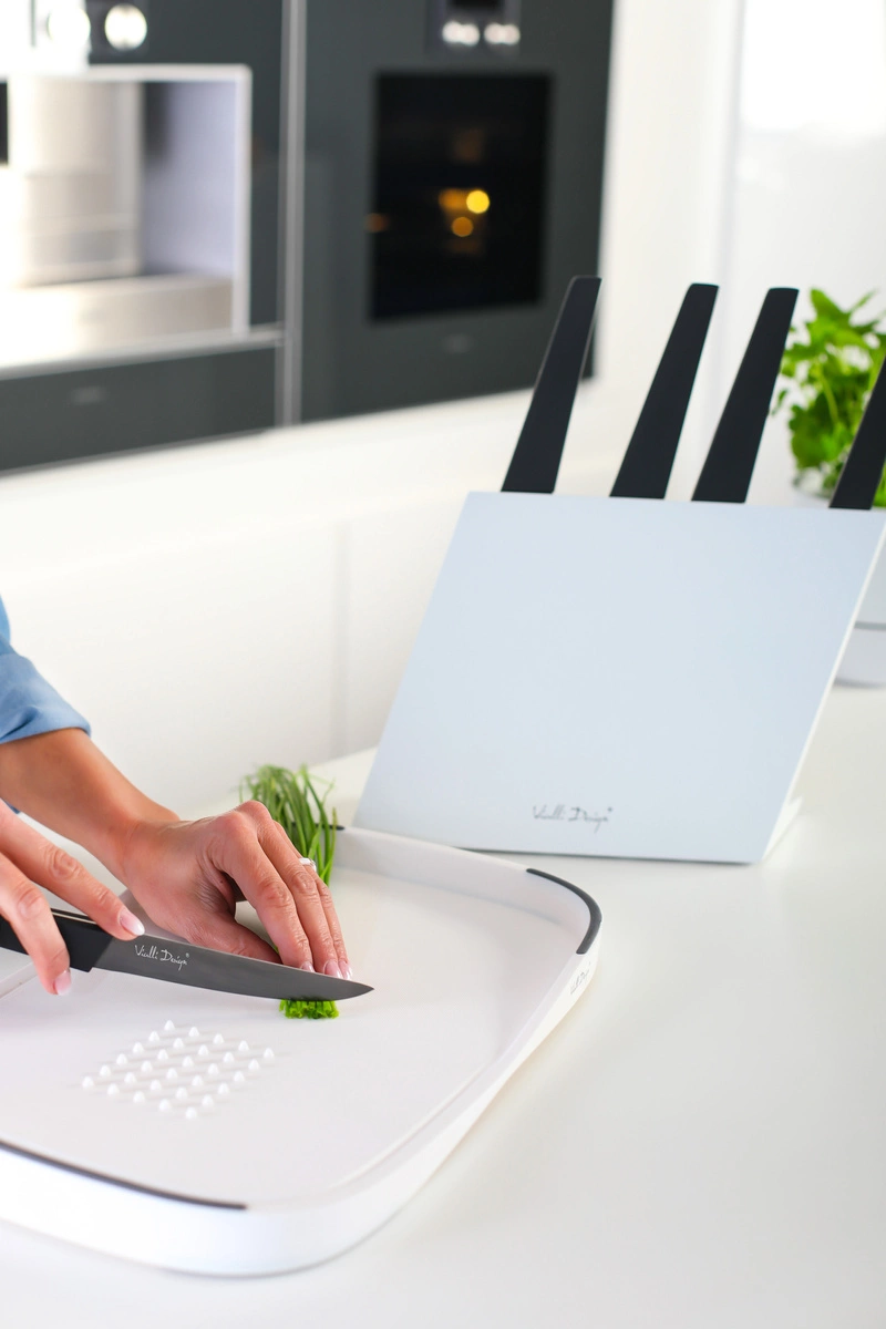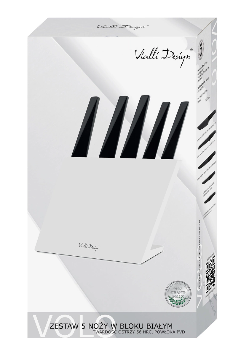 - Odkryj precyzję cięcia z zestawem 5 noży VOLO Vialli Design. Elegancki blok chroni ostrza z powłoką nieprzywierającą, zapewniając łatwość i higienę użytkowania. Podnieś standardy swojej kuchni już dziś!
