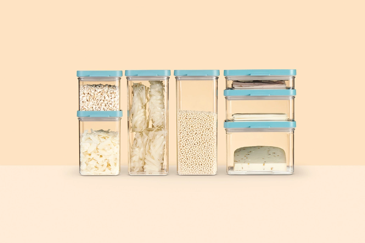 Wszystkie elementy zestawu są dostosowane do przechowywania w lodówce i pasują do siebie, co umożliwia łatwe sztaplowanie i oszczędność miejsca.
