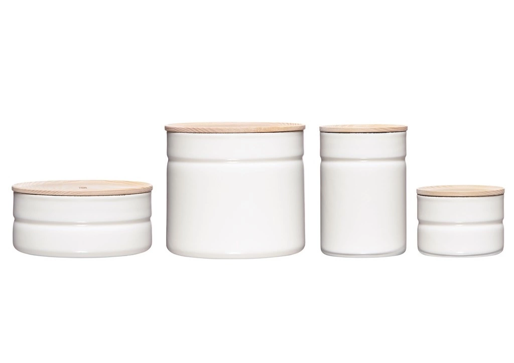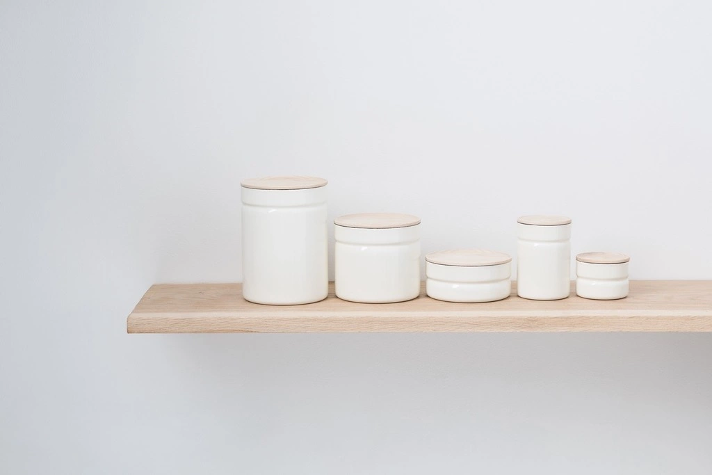 Pojemniki RIESS dostępne są w trzech różnych rozmiarach/wysokościach (6, 12 i 18 cm) i dwóch średnicach (8 cm i 13 cm) oraz w sześciu różnych kolorach: Pure White, Light Grey, Slow Green, Silent Blue, Fresh Tomato i Dark Aubergine. Wykonane są ze stalowego rdzenia pokrytego emalią ceramiczną, a wieczko z wysokiej jakości drewna jesionowego.