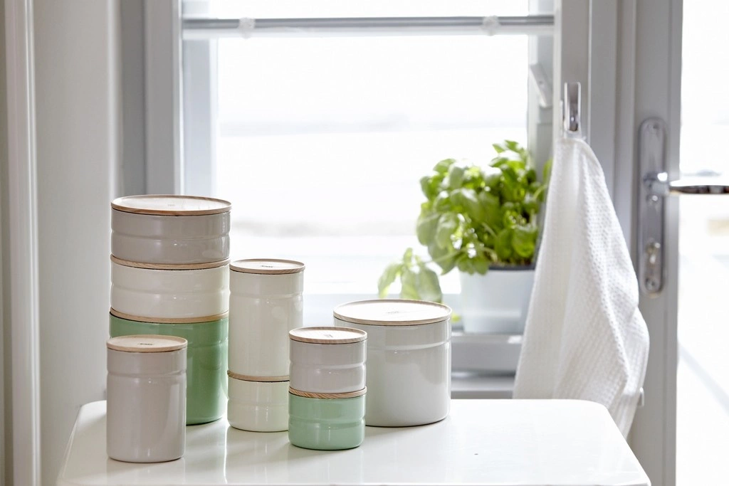 Pojemniki RIESS są dostępne w trzech różnych rozmiarach (6, 12 i 18 cm) i dwóch średnicach (8 cm i 13 cm), co pozwala na idealne dopasowanie do indywidualnych potrzeb. Wybór spośród sześciu kolorów (Pure White, Light Grey, Slow Green, Silent Blue, Fresh Tomato i Dark Aubergine) pozwala na stworzenie spójnej i estetycznej aranżacji w kuchni.
