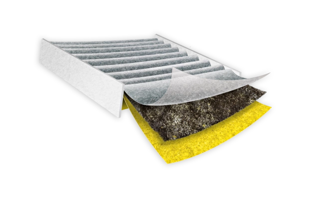 - Druga warstwa (węgiel aktywny Premium): Wysokiej jakości granulat węgla aktywnego neutralizuje nieprzyjemne zapachy oraz szkodliwe gazy, takie jak ozon, dwutlenek siarki i tlenki azotu.