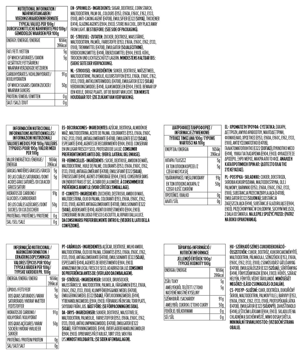 - Wysoka jakość składników: Nasza posypka jest wolna od szkodliwych barwników AZO i dwutlenku tytanu, co czyni ją bezpieczną do spożycia.