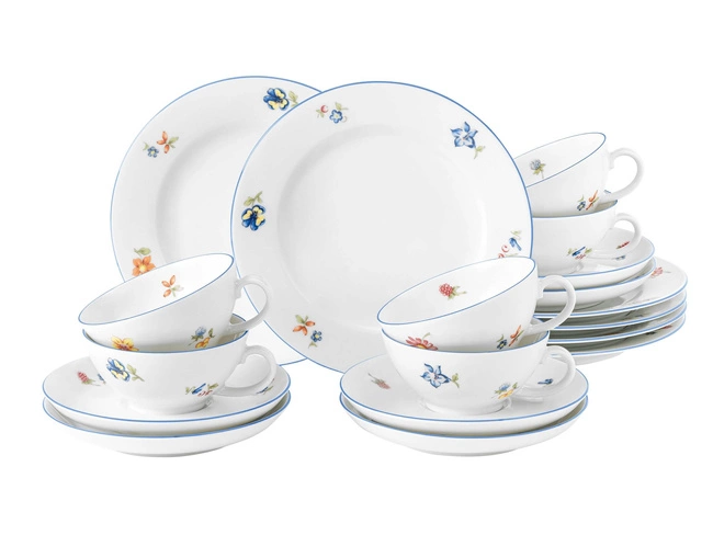 Serwis do herbaty SELTMANN SONATE NOSTALGIA wyróżnia się ciepłym odcieniem bieli, który został ozdobiony urokliwymi polnymi kwiatami oraz delikatną niebieską obwódką. To hołd dla natury, który wprowadza na stół odrobinę nostalgii i wiosennego uroku. Falowane brzegi filiżanek i talerzy dodają subtelnego wyrazu, a precyzyjne wykonanie zapewnia trwałość na lata.