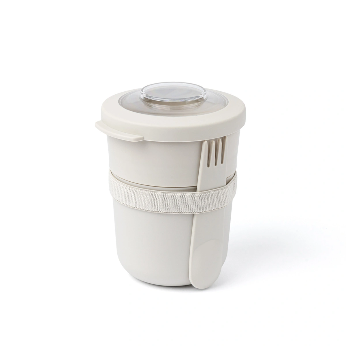 Przezroczysta pokrywka z wytrzymałego tritanu umożliwia szybkie sprawdzenie zawartości, a elastyczna opaska przytrzymuje dołączony łyżkowidelec, co sprawia, że jest zawsze pod ręką. Dzięki zgrabnemu designowi sztućca, z łatwością zjesz jogurt lub pokrojone w kostkę owoce.
