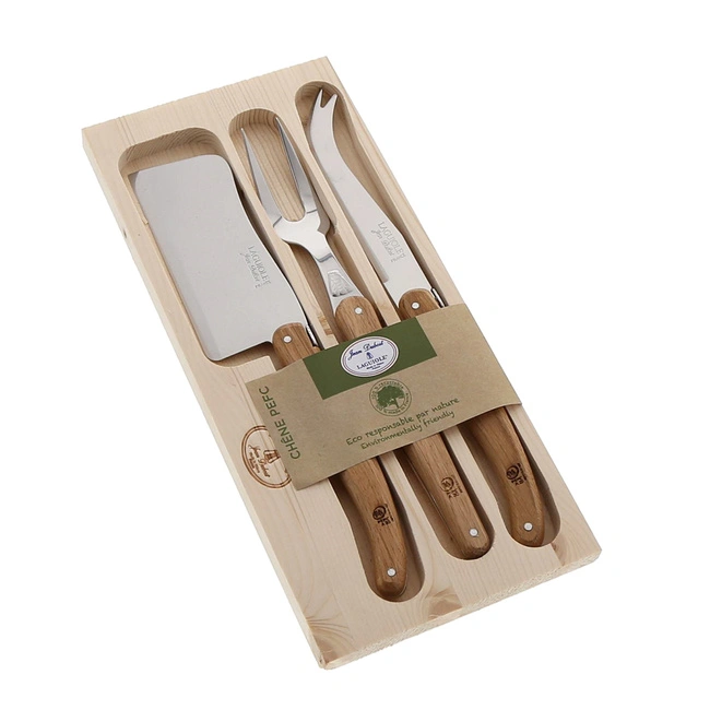 Zestaw Noży Do Sera Laguiole (Tasak, Nóż, Widelec) - Drewno Dębowe - Otwarte Pudełko - Jean Dubost