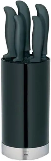 Blok na noże, w którym znajdują się akcesoria, został wykonany z tworzywa sztucznego w eleganckim czarnym kolorze. Jego minimalistyczny design sprawia, że doskonale wpasuje się w każdą aranżację kuchni. Wewnątrz bloku znajduje się wkład z pręcików z tworzywa sztucznego, który zapewnia stabilność noży i ułatwia ich przechowywanie. Co więcej, wkład nadaje się do mycia w zmywarce, co znacznie ułatwia utrzymanie czystości.