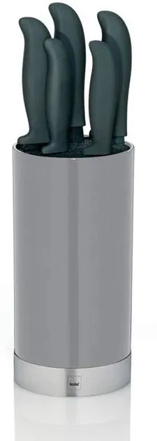 Obudowa bloku wykonana z tworzywa sztucznego w eleganckim szarym kolorze nie tylko prezentuje się estetycznie, ale również zapewnia odpowiednią stabilność i bezpieczeństwo przechowywania noży. Wymiary bloku wynoszą 34,5 cm wysokości i 11 cm średnicy, co sprawia, że zajmuje on niewiele miejsca na blacie kuchennym.