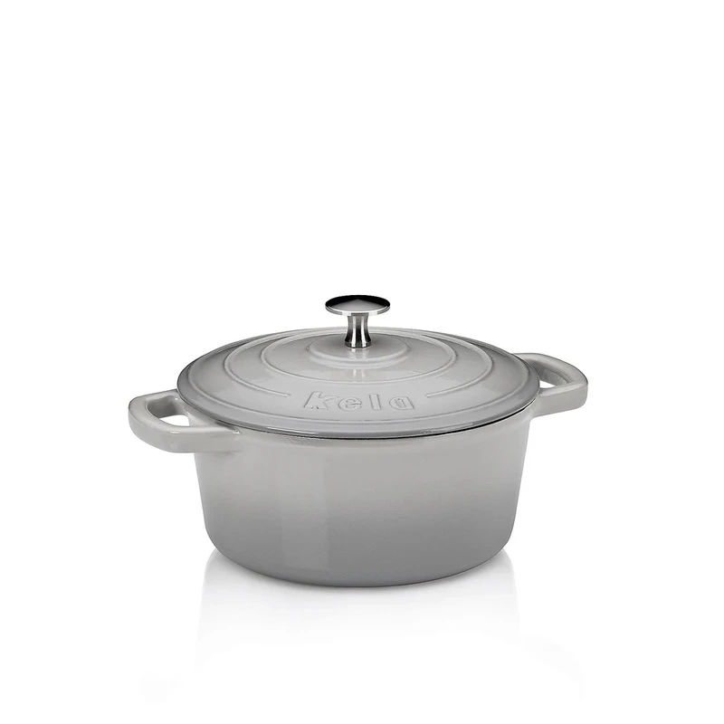 Naczynie żeliwne 4,6 L Okrągłe Jasnoszare Cal - Kela to idealny wybór dla miłośników gotowania, którzy poszukują trwałych i funkcjonalnych akcesoriów kuchennych. Wykonane z wysokiej jakości żeliwa, to naczynie zapewnia równomierne rozprowadzanie ciepła, co przekłada się na doskonałe rezultaty kulinarne. Dzięki swojej emaliowanej powierzchni zarówno wewnątrz, jak i na zewnątrz, naczynie jest nie tylko estetyczne, ale również łatwe w czyszczeniu.