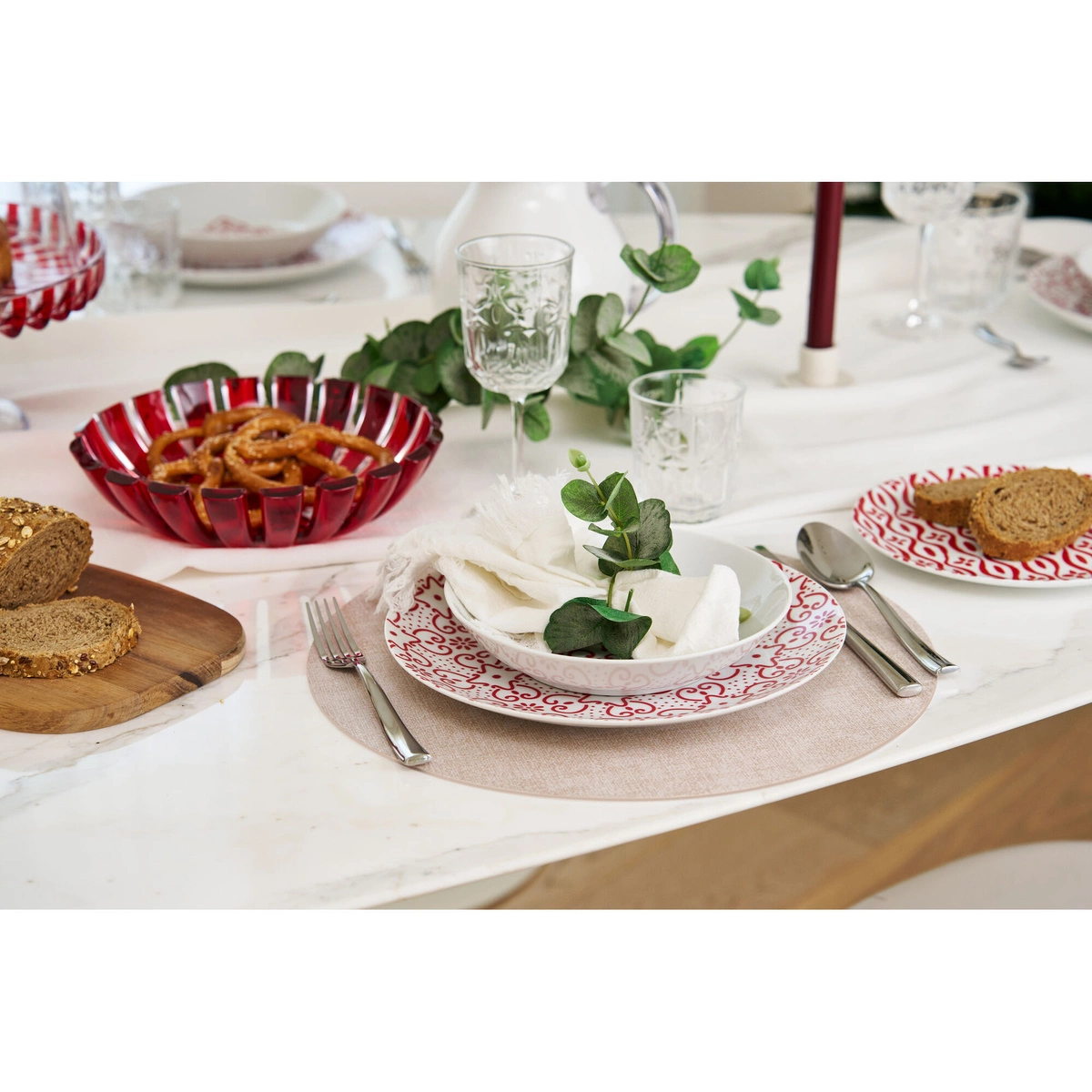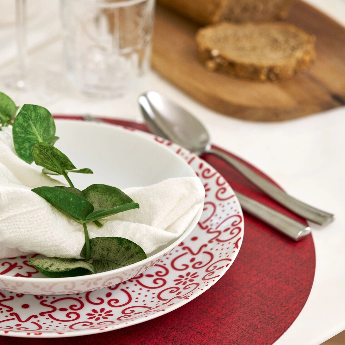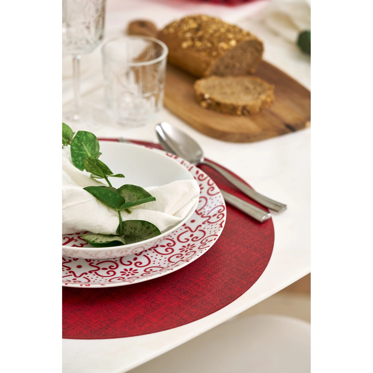 - Dwustronność: Dzięki dwóm różnym stronom, podkładka oferuje możliwość zmiany wyglądu stołu w zależności od okazji. Jedna strona ma intensywny czerwony kolor, a druga jest w neutralnym odcieniu, co pozwala na łatwe dopasowanie do wystroju wnętrza.