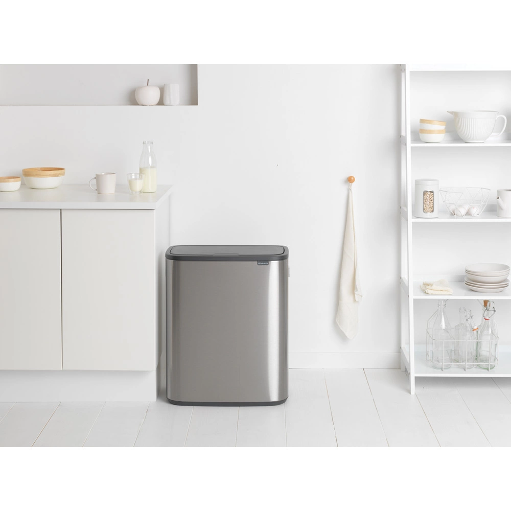 Kosz Brabantia Touch Bin BO to eleganckie i nowoczesne rozwiązanie do domów, biur i przestrzeni publicznych. Wykonany z wysokiej jakości stali nierdzewnej z matowym wykończeniem, nie tylko świetnie się prezentuje, ale również zapewnia trwałość i odporność na odciski palców dzięki powłoce antyfingerprint. Wyposażony w dwa wyjmowane pojemniki po 30 litrów, umożliwia wygodną segregację odpadów. System otwierania „Touch Bin” pozwala na łatwe otwieranie wieka za pomocą delikatnego dotknięcia.