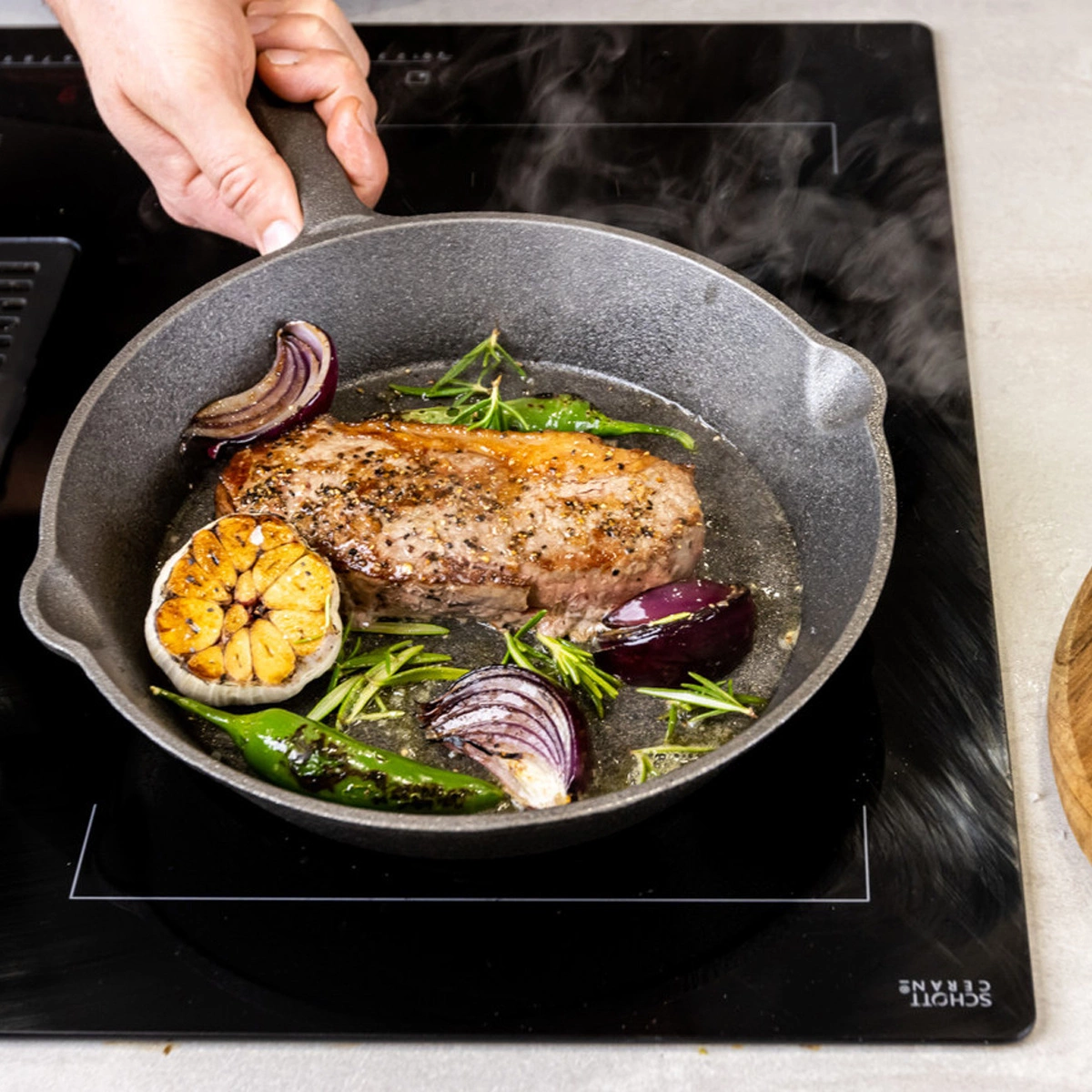 - Wszechstronność – na patelni możesz smażyć, dusić, zapiekać oraz grillować.