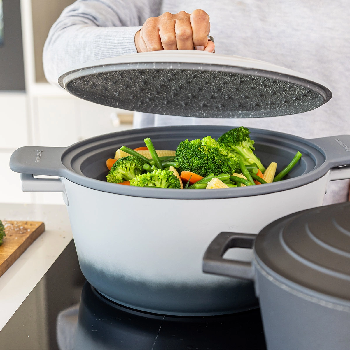 Dzięki niewielkim silikonowym nóżkom, możesz ustawić durszlak w zlewie, co umożliwia bezpieczne przelewanie zawartości garnka. Okrągły kształt oraz praktyczne uchwyty zapewniają komfort użytkowania i doskonałe dopasowanie do większości garnków.