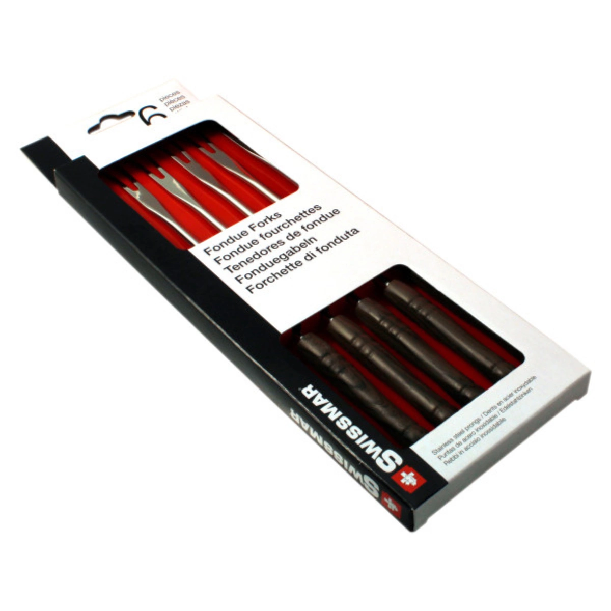 Eleganckie widelczyki do fondue mięsnego Swissmar. Zestaw 6 sztuk z drewnianymi rączkami, idealny na każdą okazję. Dodaj stylu swoim spotkan...
