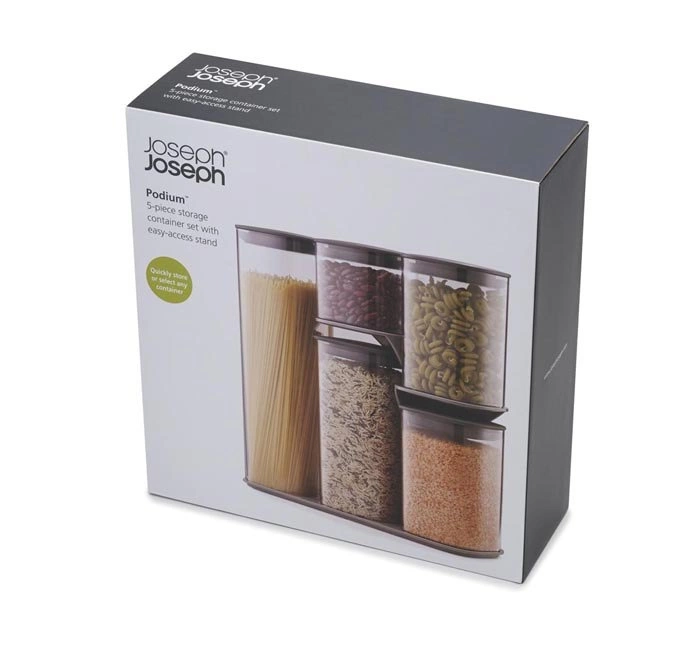 Odkryj praktyczność z zestawem 5 pojemników Podium od Joseph Joseph. Oszczędność miejsca i elegancja w każdej kuchni....