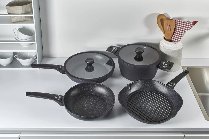 - Dno Net Induction – wykonane ze stali ferromagnetycznej, zapewnia kompatybilność z kuchenkami indukcyjnymi, gazowymi i elektrycznymi.