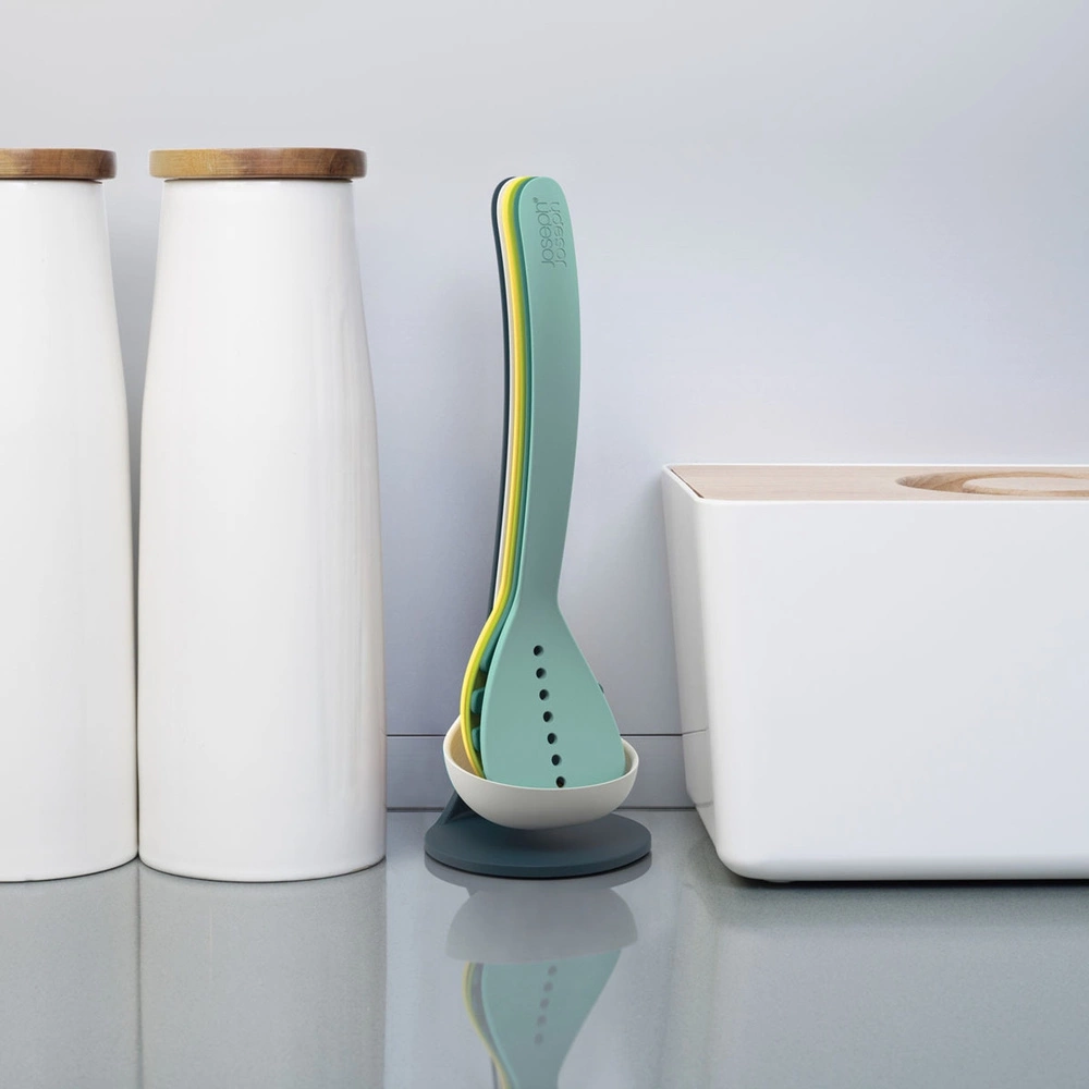 - Zestaw narzędzi kuchennych Joseph Joseph to sześć praktycznych akcesoriów na stylowym, obrotowym stojaku. W skład zestawu wchodzą m.in. łyżka cedzakowa, chochla, łopatki i łyżka do spaghetti.