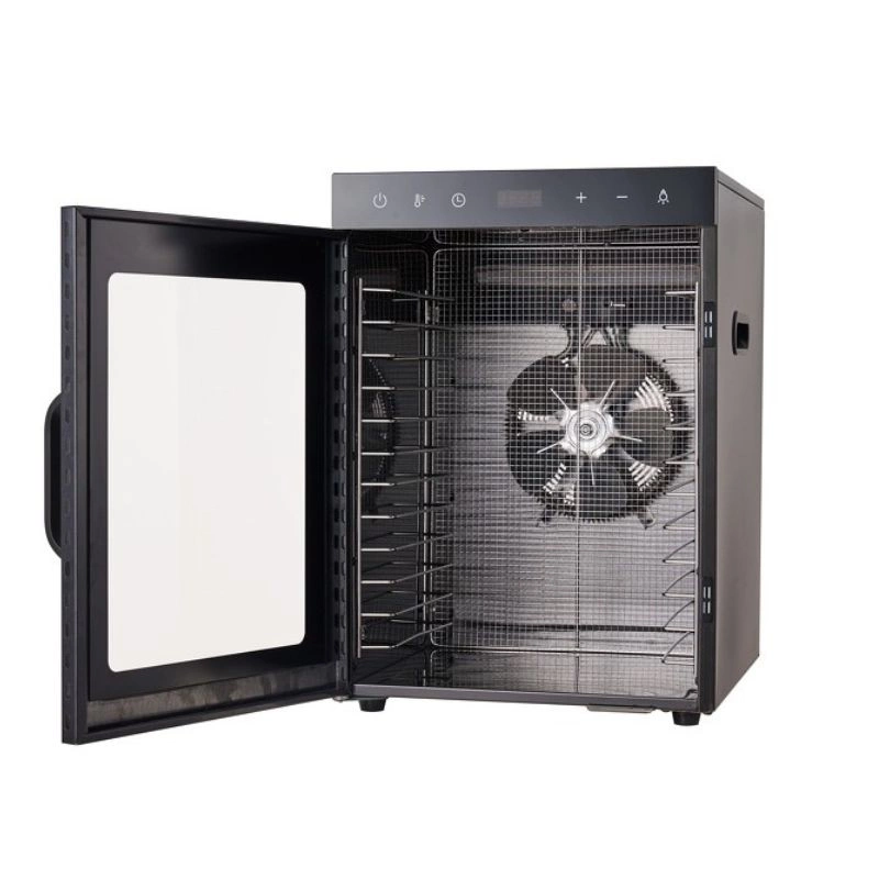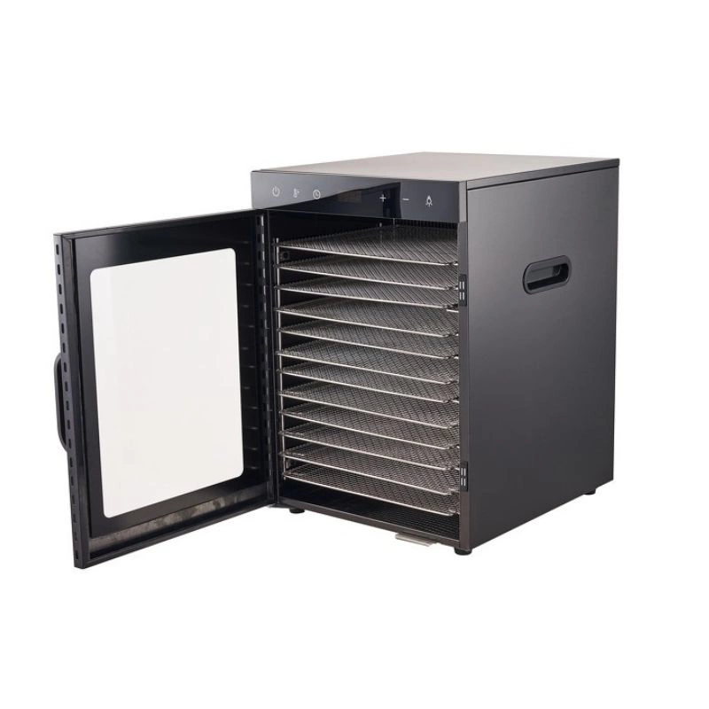 - Profesjonalna suszarka do owoców, warzyw, ziół, grzybów i mięsa z 12 stalowymi tacami i powierzchnią suszenia 1,02 m². Regulacja temperatury 25–90°C, timer do 72 h, podświetlenie LED i równomierny obieg powietrza.