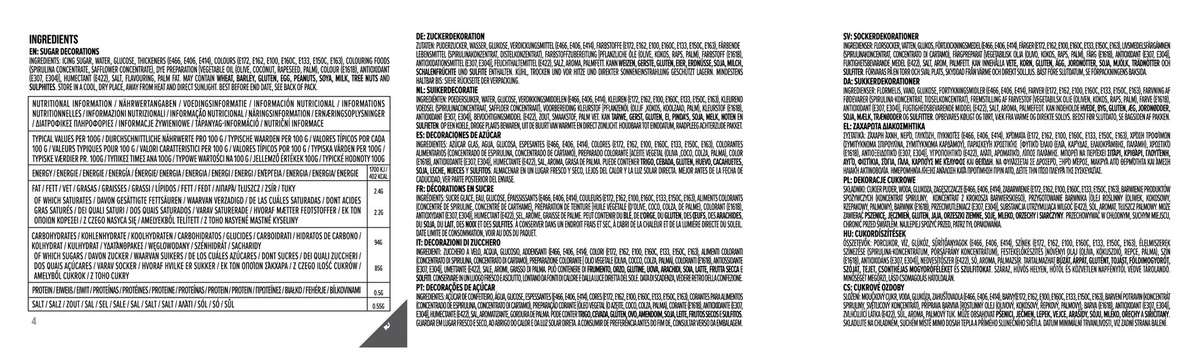 Skład: cukier puder, woda, glukoza, środki zagęszczające (E466, E406, E414), barwniki (E172, E162, E100, E160c, E133, E150c, E163), koncentraty barwiące pochodzenia roślinnego (koncentrat ze spiruliny, koncentrat z krokosza barwierskiego), preparat barwiący pochodzenia roślinnego [olej roślinny (oliwa, kokosowy, rzepakowy, palmowy), barwnik (E161b), przeciwutleniacze (E307, E304)], substancja utrzymująca wilgoć (E422), sól, aromat, tłuszcz palmowy.