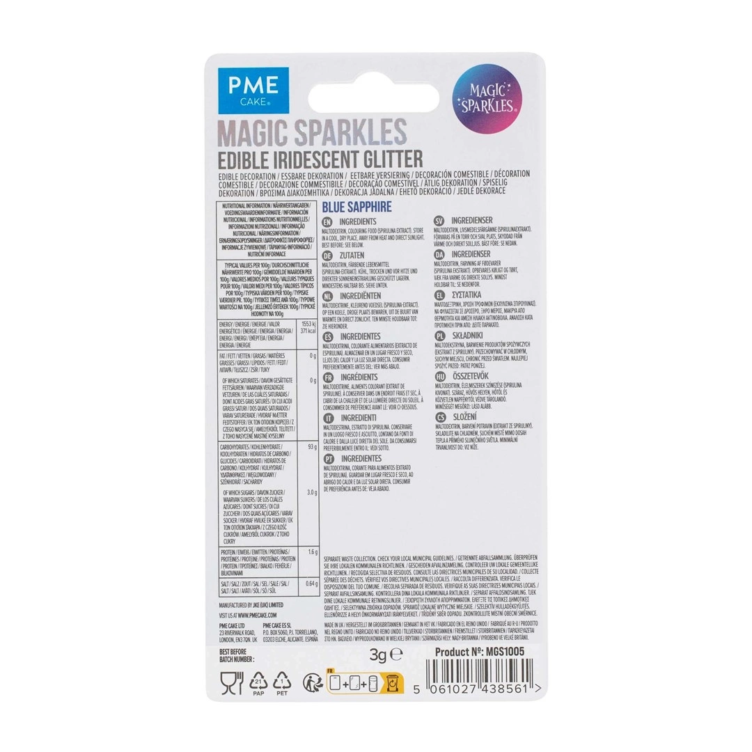 Niebieski jadalny brokat PME Magic Sparkles zachwyca opalizującym, wielowymiarowym blaskiem. Subtelne, drobniutkie płatki odbijają światło pod różnymi kątami, tworząc niesamowity efekt wizualny. Idealnie sprawdzi się zarówno na dużych tortach, jak i drobnych słodkościach, podkreślając ich wyjątkowość.