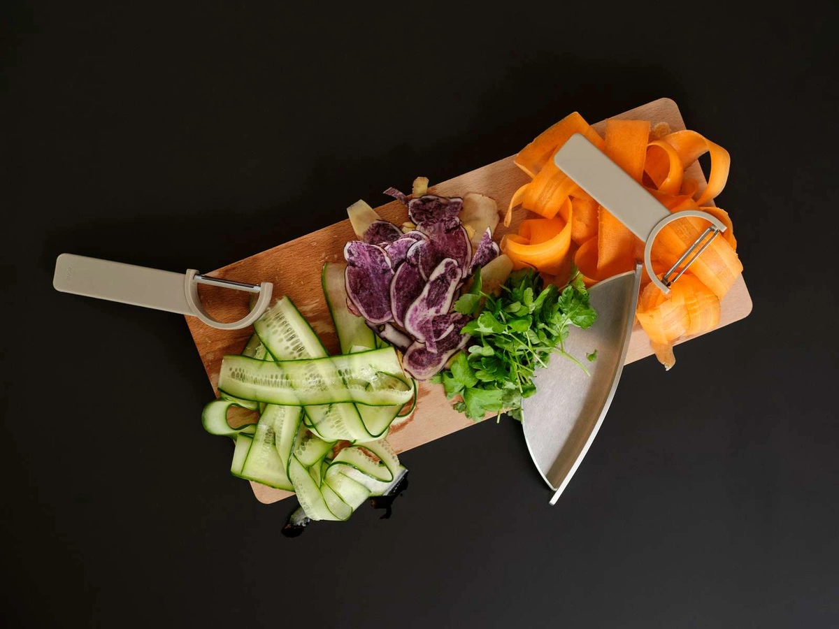 Praktyczny zestaw kuchenny: Obieraczka 2 szt + siekacz Soft Taupe