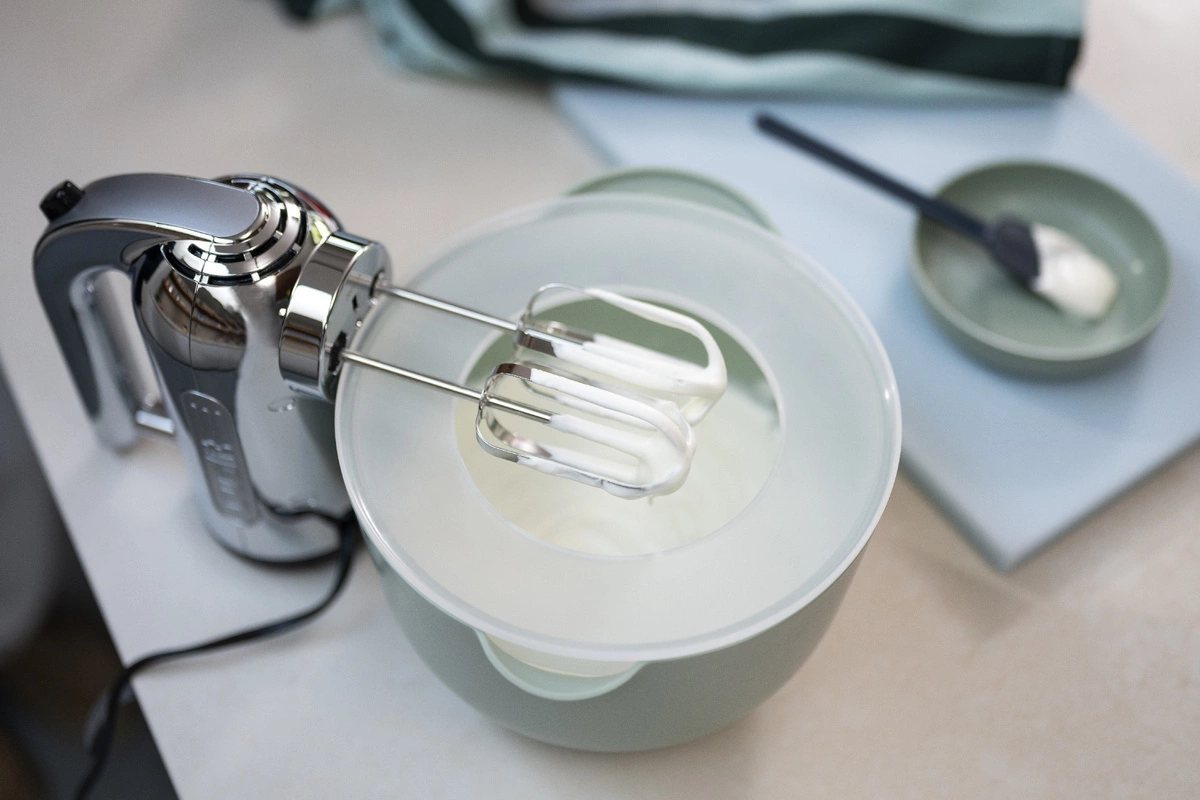 - Pokrywka odporna na rozchlapywanie – innowacyjne rozwiązanie, które zapewnia czystość w kuchni. Otwór na mikser został zaprojektowany tak, aby składniki nie wydostawały się na zewnątrz, co eliminuje problem bałaganu.