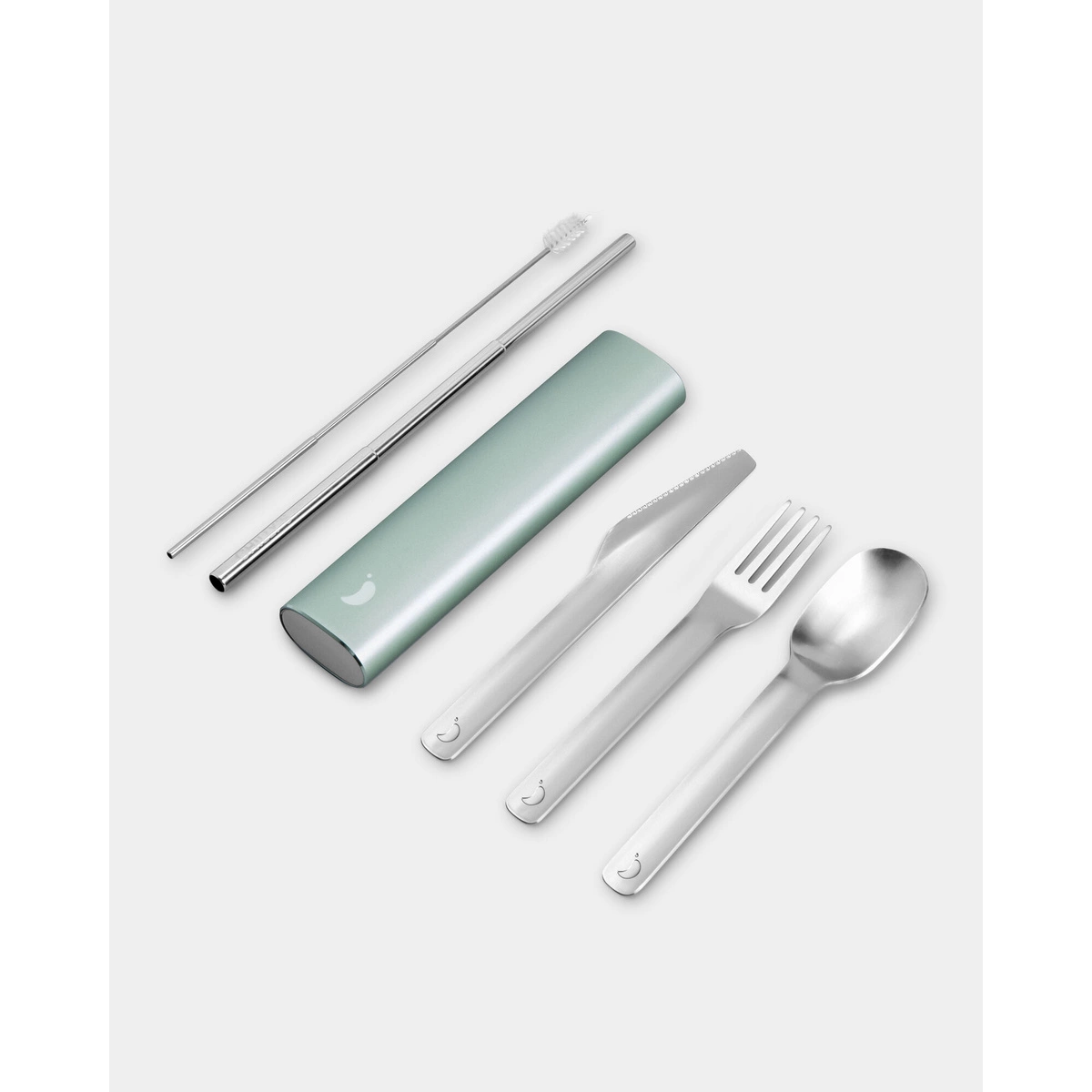 Wszystkie sztućce są zapakowane w elegancką aluminiową obudowę, co zapewnia schludne przechowywanie i łatwość transportu. Zestaw jest niezwykle kompaktowy i funkcjonalny, co sprawia, że idealnie nadaje się do zabrania w podróż, na piknik czy do biura.