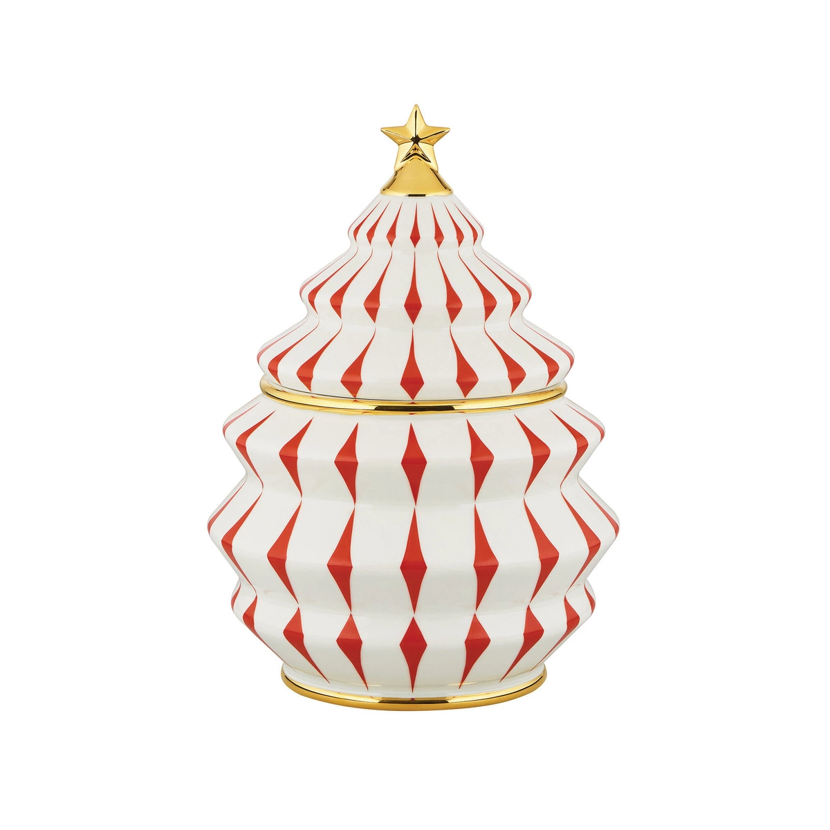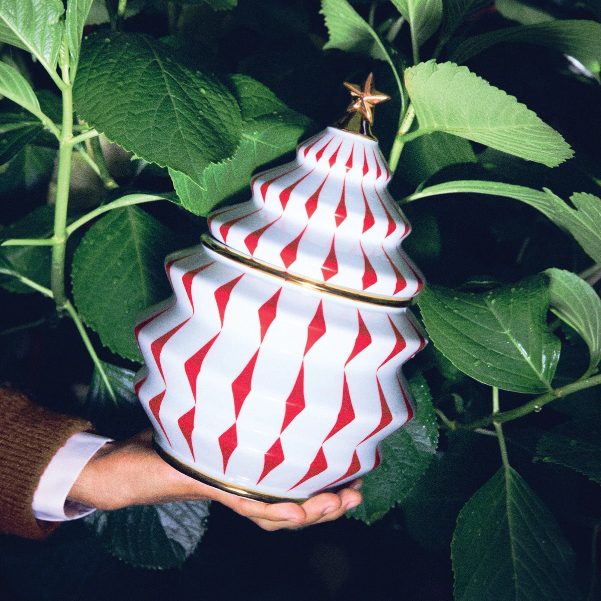 Projekt Niki Zupanc, inspirowany klasycznymi symbolami świątecznymi, nadaje pojemnikowi na ciastka wyjątkowego uroku. Jego kształt przypominający ośnieżoną choinkę przyciąga wzrok i wzbudza pozytywne emocje. Tradycyjne kolory, takie jak biel, czerwień i złoto, w połączeniu z nowoczesnym stylem tworzą harmonijną całość, która doskonale wpisuje się w klimat świąteczny.