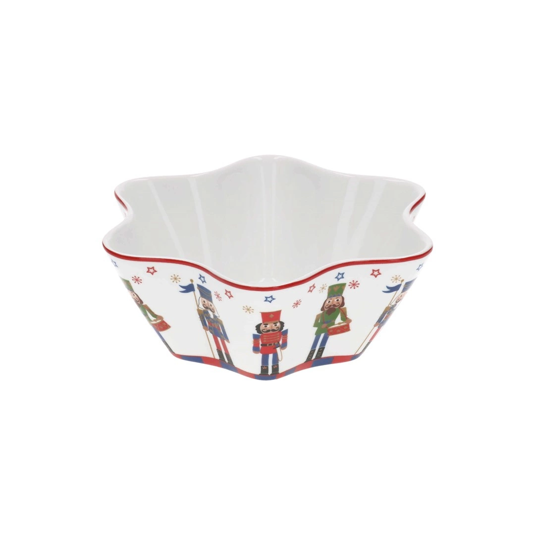 Miska w kształcie gwiazdy, zdobiona motywem dziadka do orzechów, to prawdziwe dzieło sztuki. Jej urokliwy wygląd sprawia, że staje się nie tylko praktycznym elementem zastawy, ale również stylowym dodatkiem do każdego wnętrza. Delikatne zdobienia wprowadzają radosny nastrój, idealnie komponując się z atmosferą świątecznych spotkań.