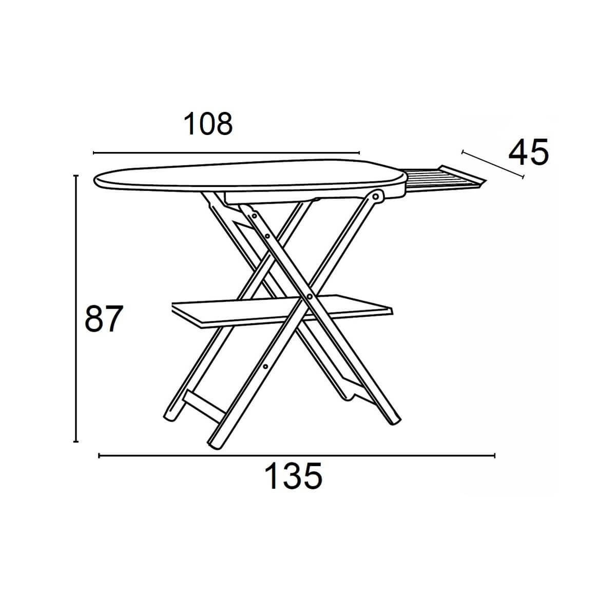 Deska ARREDAMENTI ASTIR charakteryzuje się wysokością blatu wynoszącą 87 cm, co pozwala na wygodne prasowanie bez nadmiernego schylania się. Jej szeroka powierzchnia robocza o wymiarach 135 x 45 cm z ocynkowanego i perforowanego metalu zapewnia równomierne rozprowadzanie pary, co znacznie ułatwia usuwanie zagnieceń.