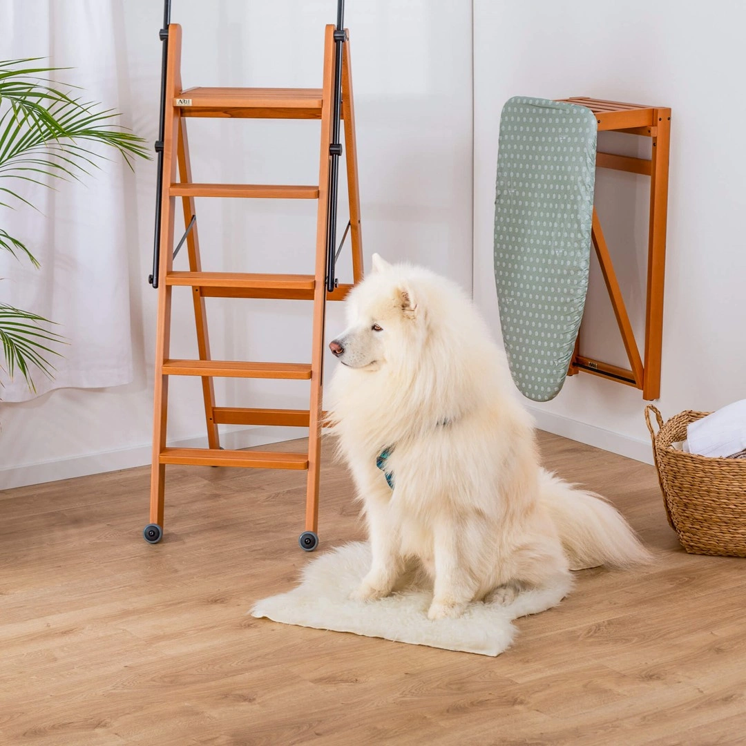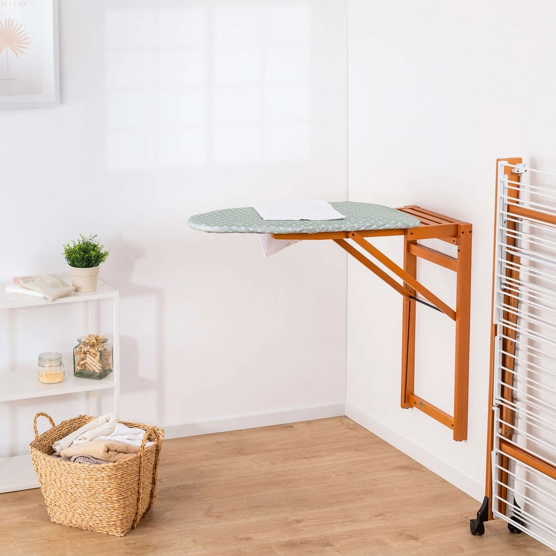 - Stabilny uchwyt na żelazko: Wykonany z litego drewna bukowego uchwyt o wymiarach 39 x 27 cm zapewnia bezpieczne miejsce na żelazko w trakcie prasowania.