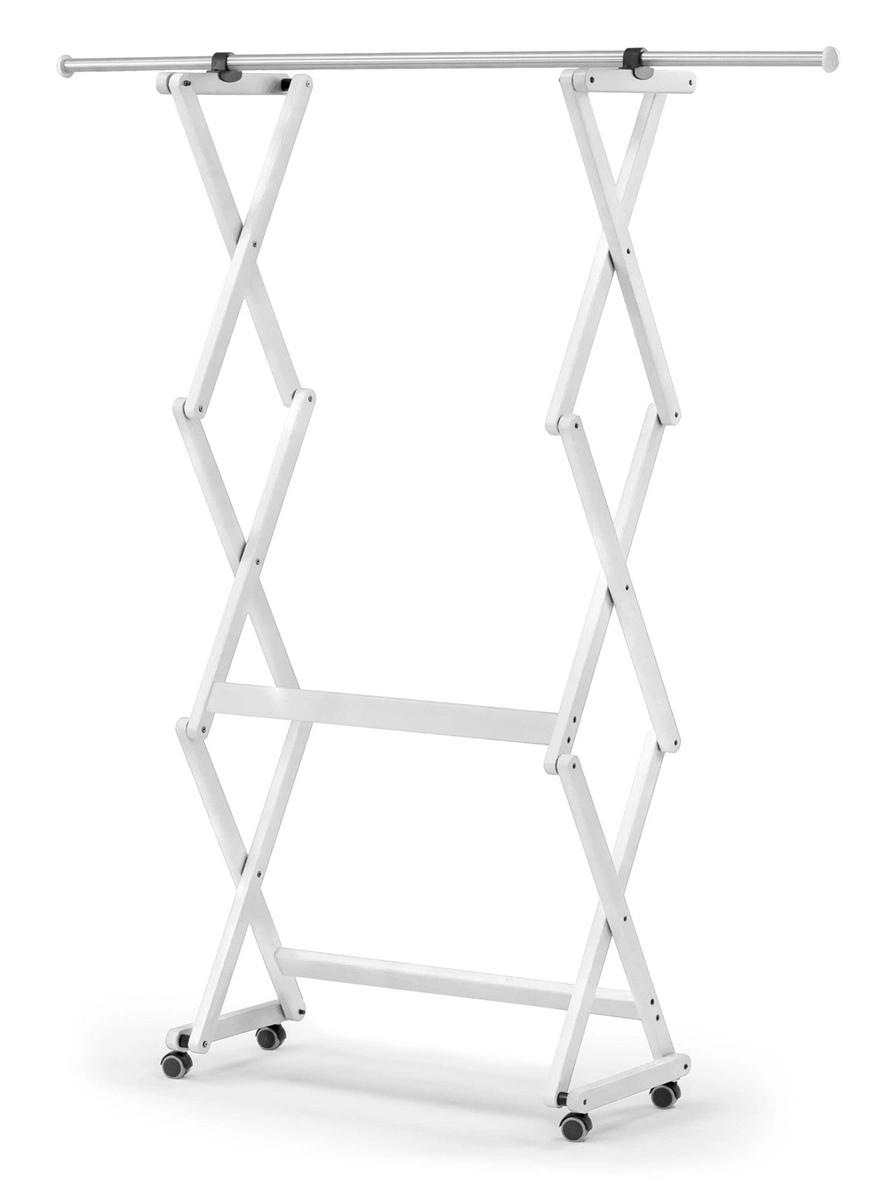 Wieszak wyposażony jest w regulowany stalowy drążek, który można rozszerzyć od 78 do 140 cm. Dzięki temu, użytkownik ma możliwość dostosowania go do swoich potrzeb, co sprawia, że jest on idealnym rozwiązaniem do przechowywania zarówno codziennej garderoby, jak i większej ilości ubrań sezonowych. Drążek rozsuwany jest z dwóch stron, co zwiększa jego funkcjonalność i elastyczność użytkowania.