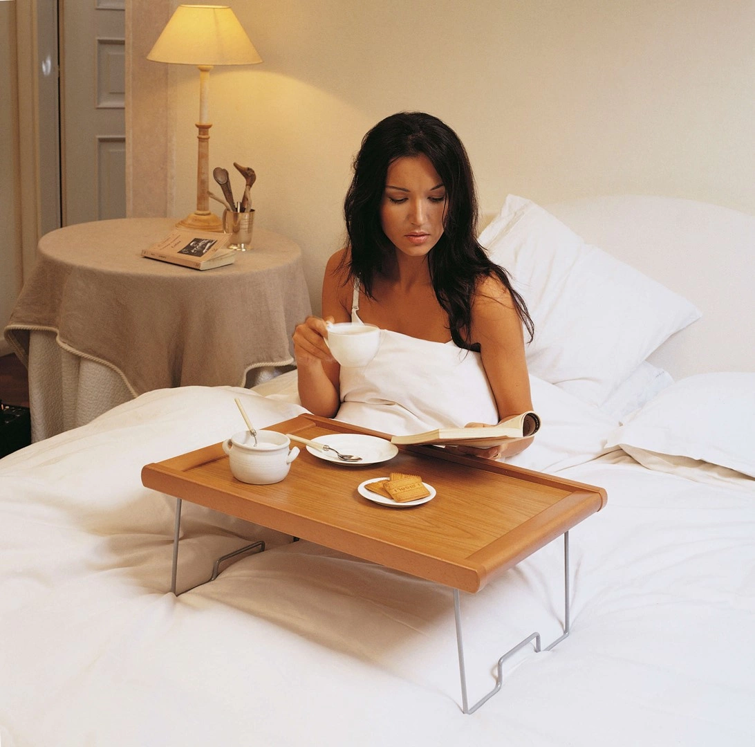 - Stabilność i wygoda: Taca jest solidna i stabilna, co sprawia, że doskonale sprawdzi się jako stół do śniadania w łóżku, przenośny stolik do laptopa, a także mobilna podstawka na książki czy tablet.