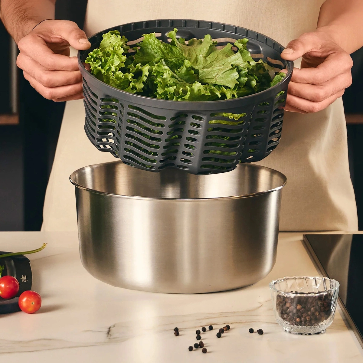 Jedną z najważniejszych cech wirówki Zyliss jest jej wszechstronność. Po wyjęciu wewnętrznego koszyczka, produkt może służyć jako elegancka stalowa misa do serwowania sałatek lub innych potraw. To idealne rozwiązanie dla tych, którzy cenią sobie funkcjonalność i estetykę w kuchni.