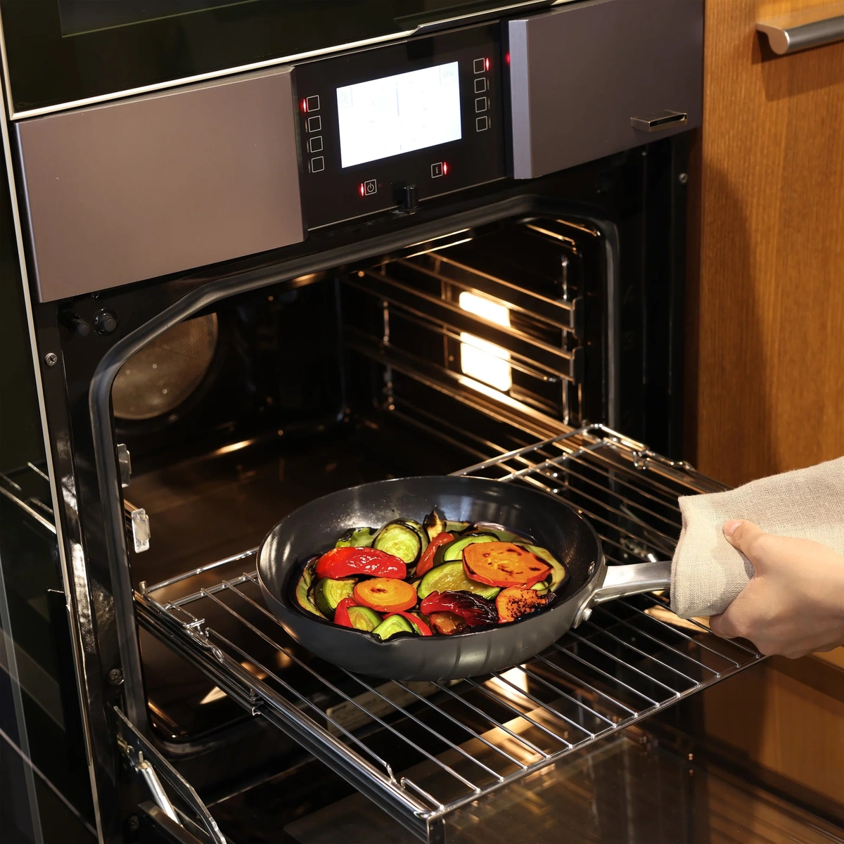 - Wszechstronność – patelnia nadaje się do wszystkich rodzajów kuchenek, w tym indukcyjnych, a także można ją wstawiać do piekarnika do temperatury 230°C.