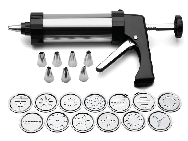 Innowacyjny design pistoletu zawiera przedni gwint oraz adapter do wymiany nasadek, co sprawia, że jego użytkowanie jest niezwykle przyjemne i intuicyjne. Dzięki różnorodnym nasadkom, które można łatwo wymieniać, masz możliwość tworzenia wielu rodzajów ciastek i dekoracji, dostosowanych do różnych okazji.