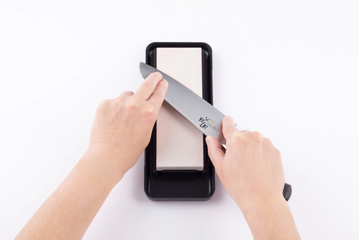 - Przesuwaj nóż po kamieniu pod odpowiednim kątem, aby uzyskać optymalne ostrzenie.