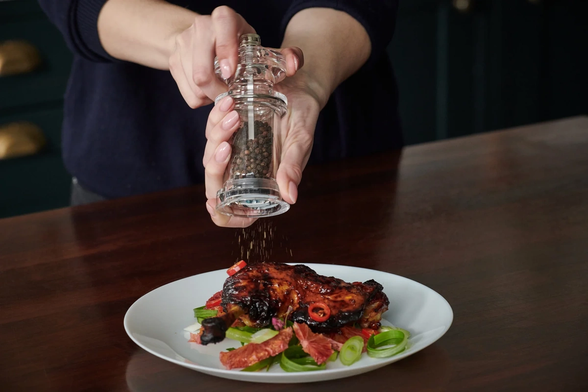 - Akrylowy Korpus: Przezroczysty materiał pozwala na bieżąco kontrolować ilość przyprawy, jaką posiadasz w młynku.