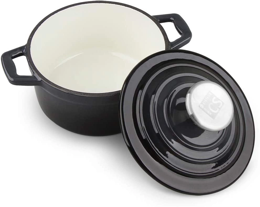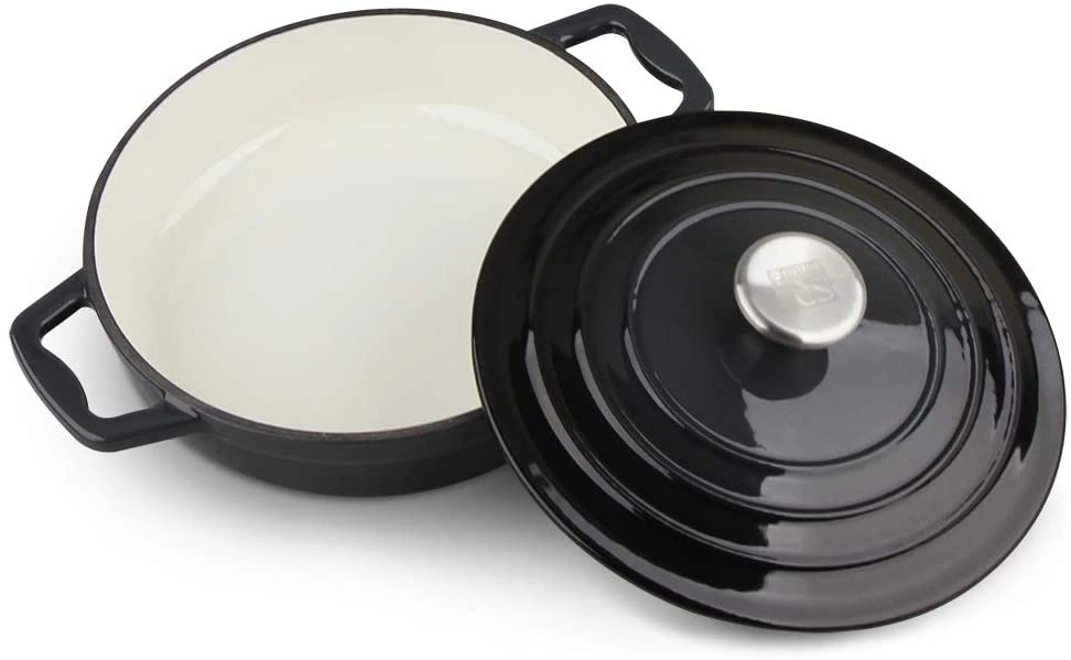 Każde naczynie ma pokrywę wykonaną z odpornej stali nierdzewnej, co zapewnia dodatkową trwałość i estetykę. Wnętrze naczyń pokryte jest gładką, jasnokremową emalią Pronamel Plus, która nie tylko zabezpiecza żeliwo, ale także ułatwia czyszczenie.