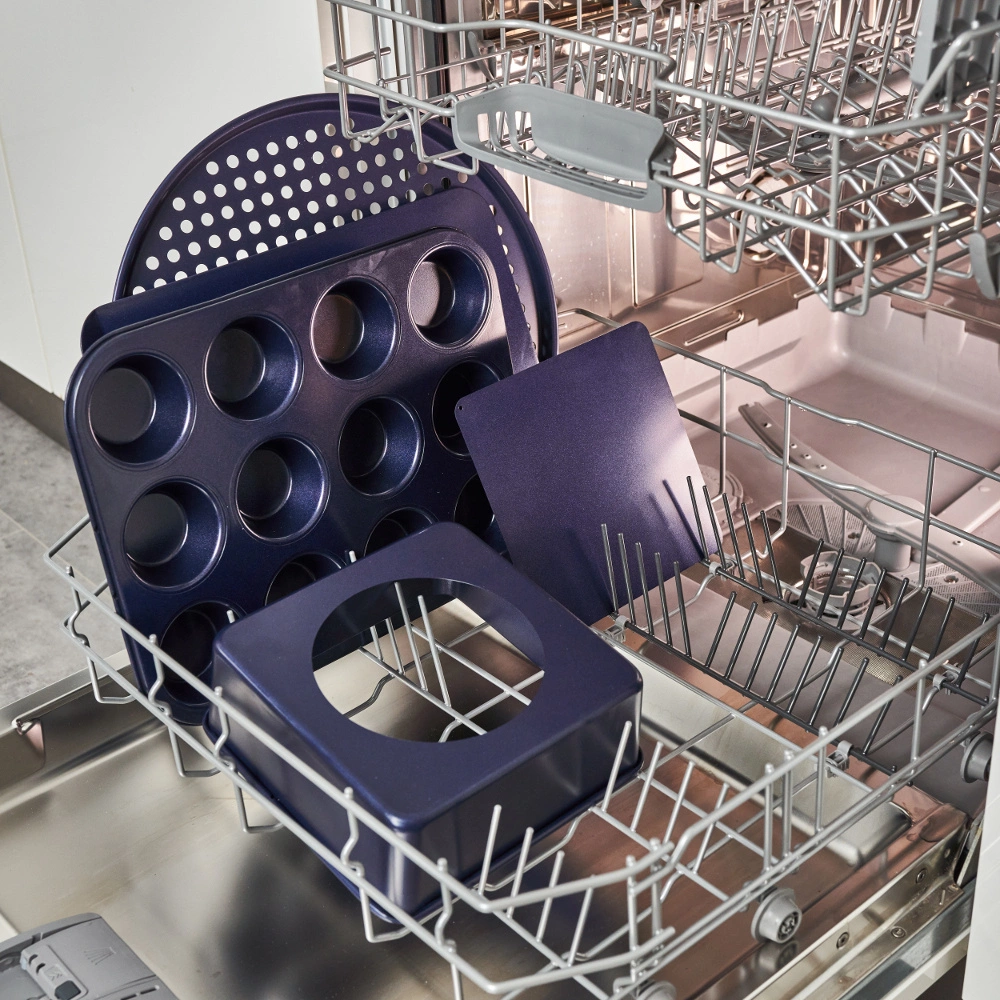 - Powłoka nieprzywierająca: Dwukrotne pokrycie powłoką Qantum II, która przypomina emalię w eleganckim granatowym kolorze, sprawia, że ciasto nie przywiera do formy.