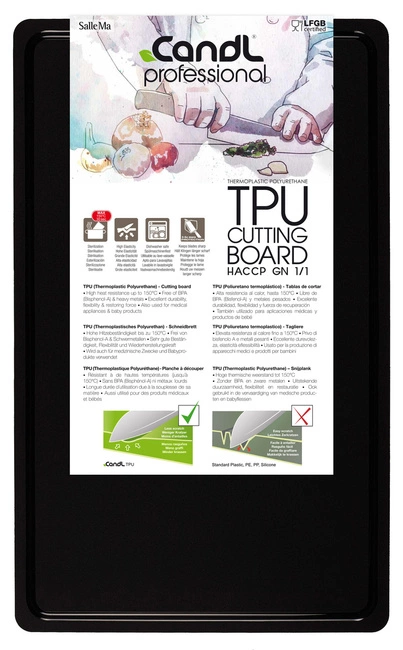 Mata została wzbogacona dodatkiem węgla, co podnosi jej właściwości antybakteryjne. To sprawia, że jest idealnym wyborem nie tylko do krojenia, ale również do serwowania potraw. Wykonana z termoplastycznego poliuretanu (TPU), mata zapewnia wysoki poziom elastyczności, co chroni ostrza noży przed tępiem. Dzięki dużej gęstości tworzywa, ogranicza również powstawanie nacięć i uderzeń, co wpływa na dłuższą żywotność zarówno maty, jak i narzędzi kuchennych.