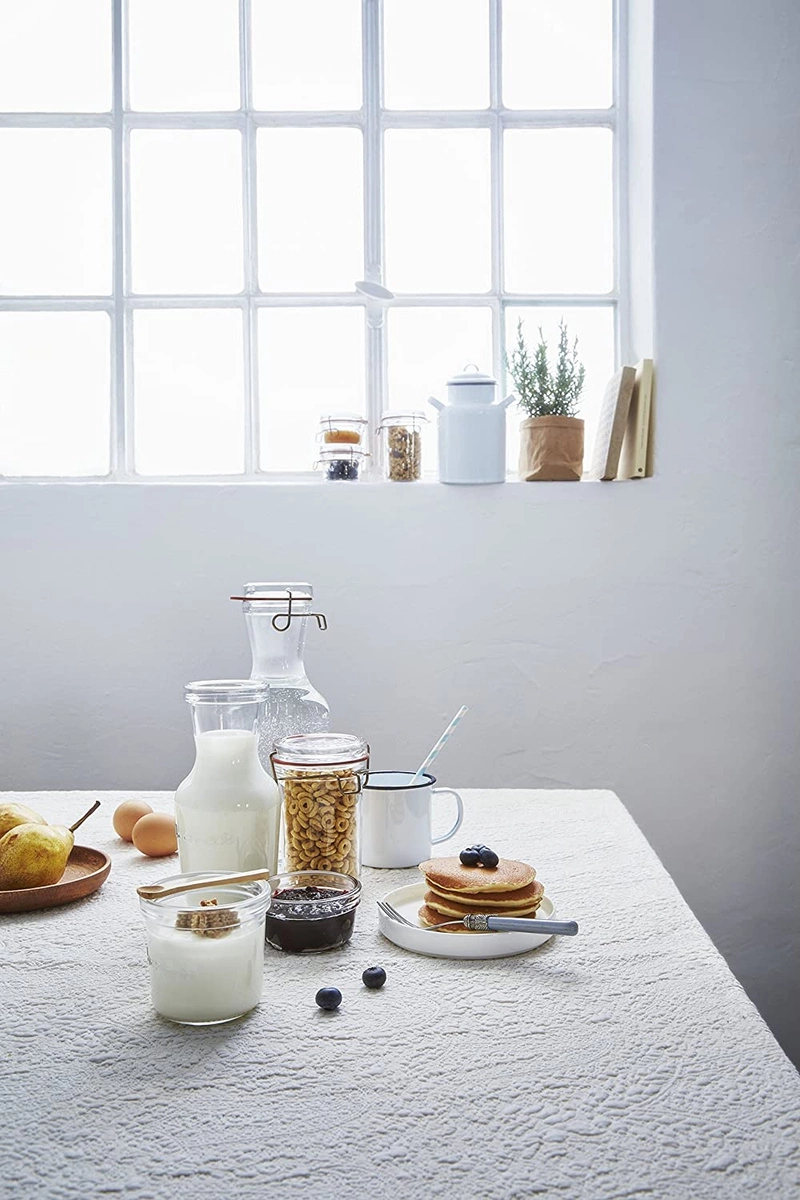 Dzięki płaskiej pokrywie, butelki można układać jedną na drugiej, co oszczędza cenną przestrzeń w kuchni. Dodatkowo, naczynia z serii Lock Eat można używać w kuchence mikrofalowej oraz myć w zmywarce (z wyjątkiem stalowego zacisku).