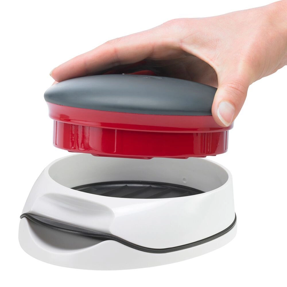 - Nieprzywierająca taca: Czarna, wysuwana tacka wykonana z materiału nieprzywierającego pozwala na "bezdotykowe" przełożenie uformowanego burgera na patelnię lub grill, co znacznie ułatwia proces gotowania.