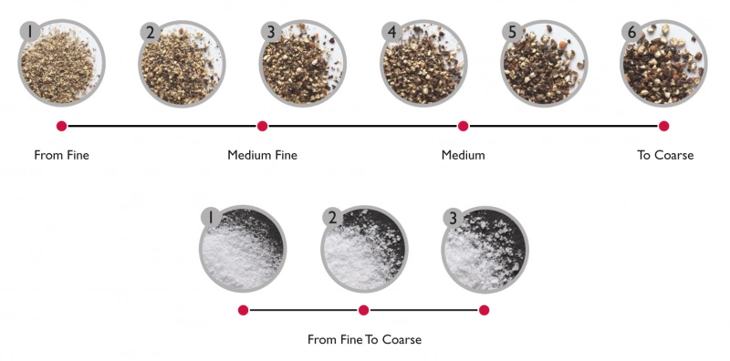- Regulacja Mielenia: Posiada krokową regulację mielenia, która pozwala na precyzyjne dostosowanie grubości mielenia pieprzu w 6 różnych ustawieniach. Dzięki temu możesz dostosować smak do swoich potrzeb - grubszy pieprz idealnie podkreśli smak steków, a drobniej zmielony doda aromatu sosom i zupom.