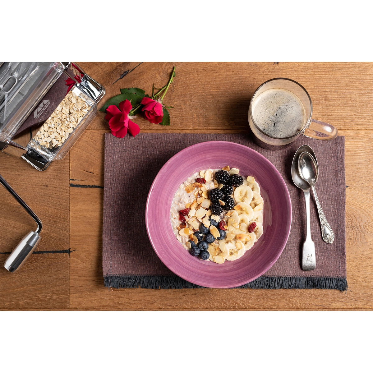 Marga Mulino to jedyny młynek, który umożliwia przygotowanie mąki oraz płatków z ziaren w zaledwie kilka minut. Dzięki możliwości mielenia zarówno zbóż miękkich, takich jak owies, jęczmień i żyto, jak i zbóż twardych, takich jak orkisz, kamut, ryż czy gryka, jest to urządzenie niezwykle wszechstronne.